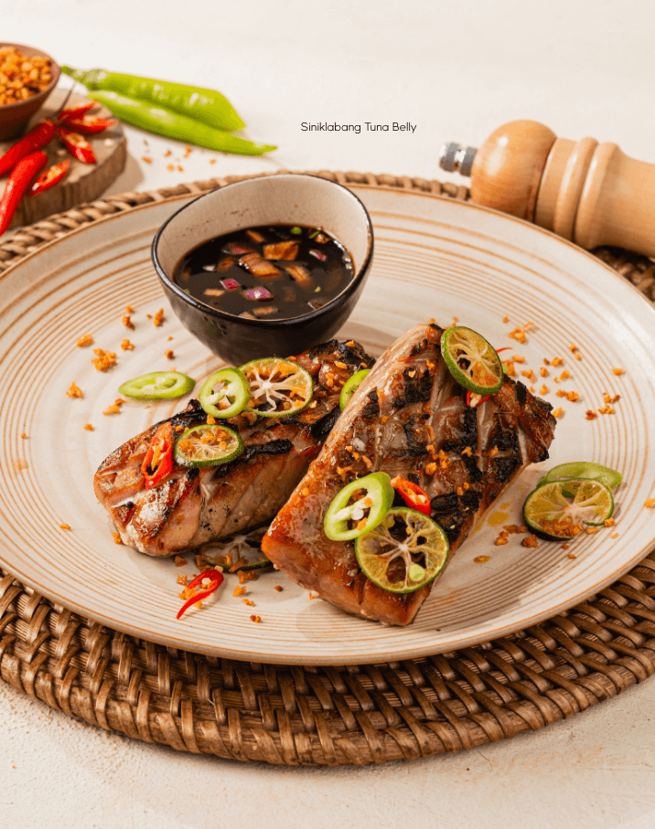 Grilled marinated tuna belly, fried garlic, spring onion, green chili, soy vinegar dip